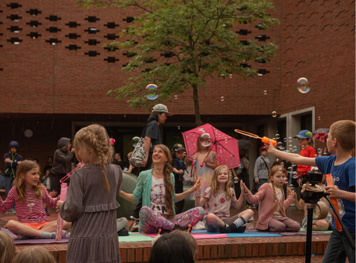 am Fortbildungsvormittag werden je nach räumlichen Kapazitäten bis zu themengleiche 4 Kinderyoga Mitmachkonzerte für Kinder plus Erzieher durchgeführt. Das Starterset befähigt nach dem Erlebnis, neue Kinderyoga-Einheiten für die Kinder zu gestalten.